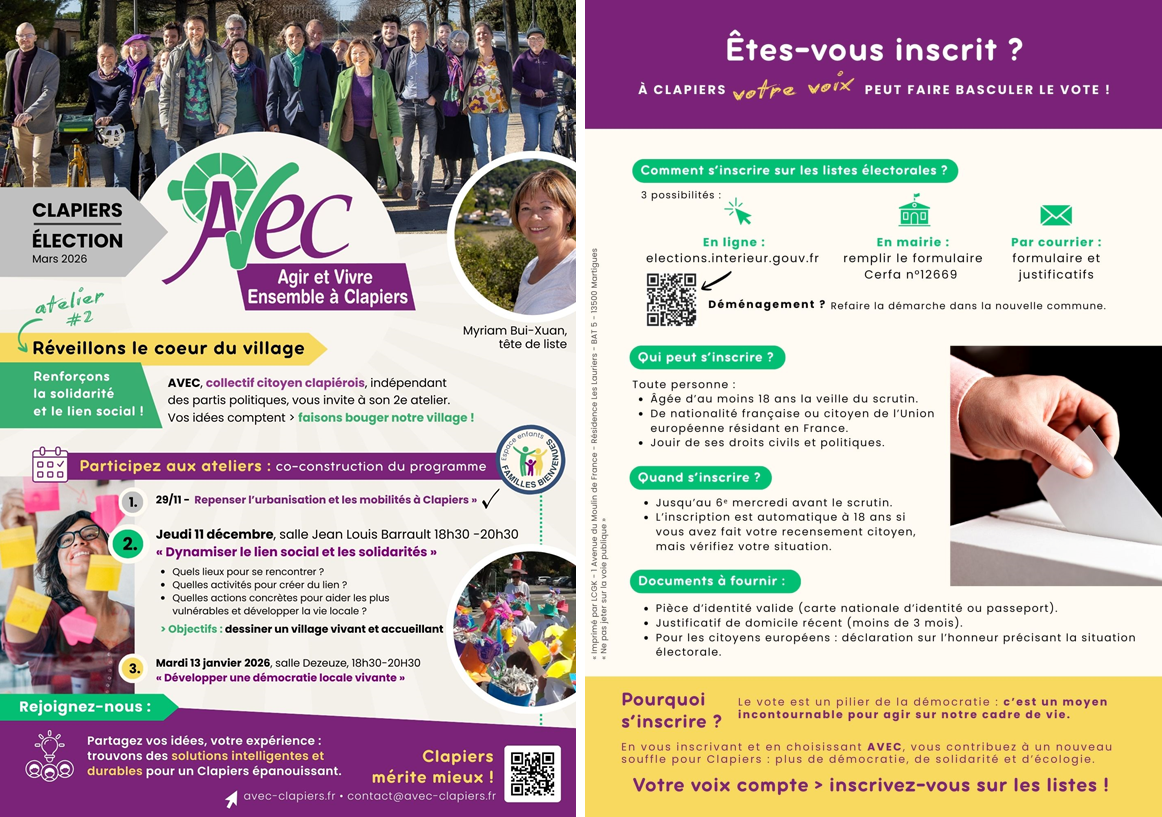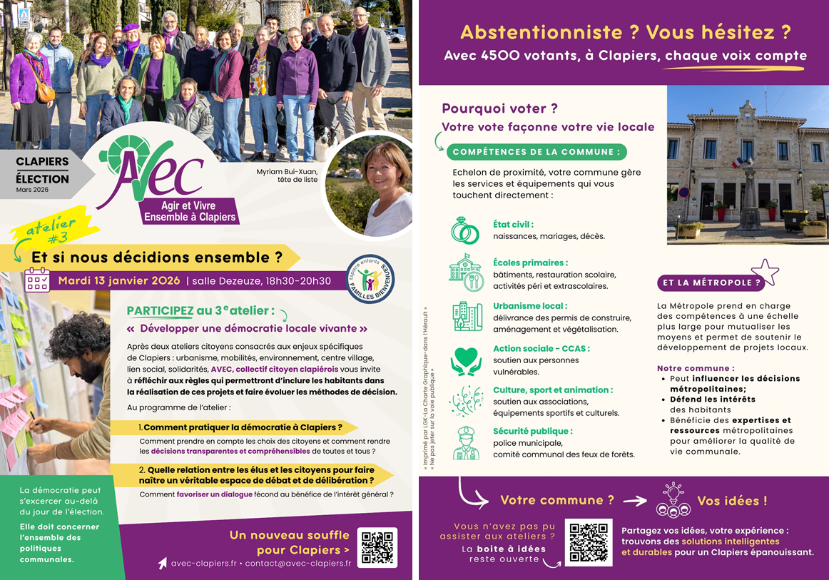 Notre démarche se détache du modèle de gouvernance traditionnelle : les projets proposés pour l’avenir de notre Clapiers sont co-construits avec vous, habitants, commerçants, membres d’associations, lors des ateliers participatifs que nous avons organisés jusqu’en janvier.